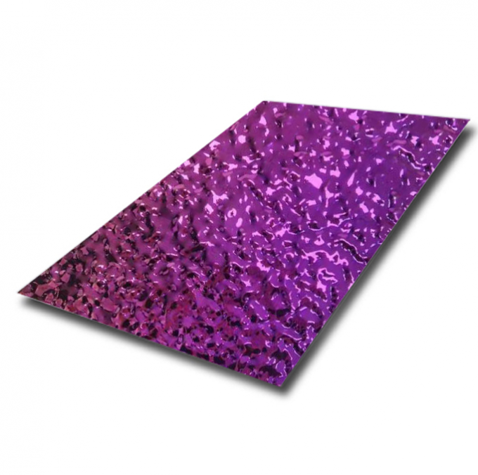 Eleve sus proyectos arquitectónicos con nuestras láminas de acero inoxidable con efecto onda de agua y espejo PVD morado. Este innovador material decorativo combina la durabilidad atemporal del acero inoxidable con una estética de vanguardia. La superficie se somete a un proceso de pulido de espejo 8K de alta precisión seguido de un sofisticado tratamiento de recubrimiento al vacío PVD (deposición física de vapor) para lograr un tono morado vibrante y profundo. La distintiva textura de "onda de agua" o martillada se estampa en el metal, creando un efecto 3D dinámico que imita el suave movimiento del agua bajo la luz.